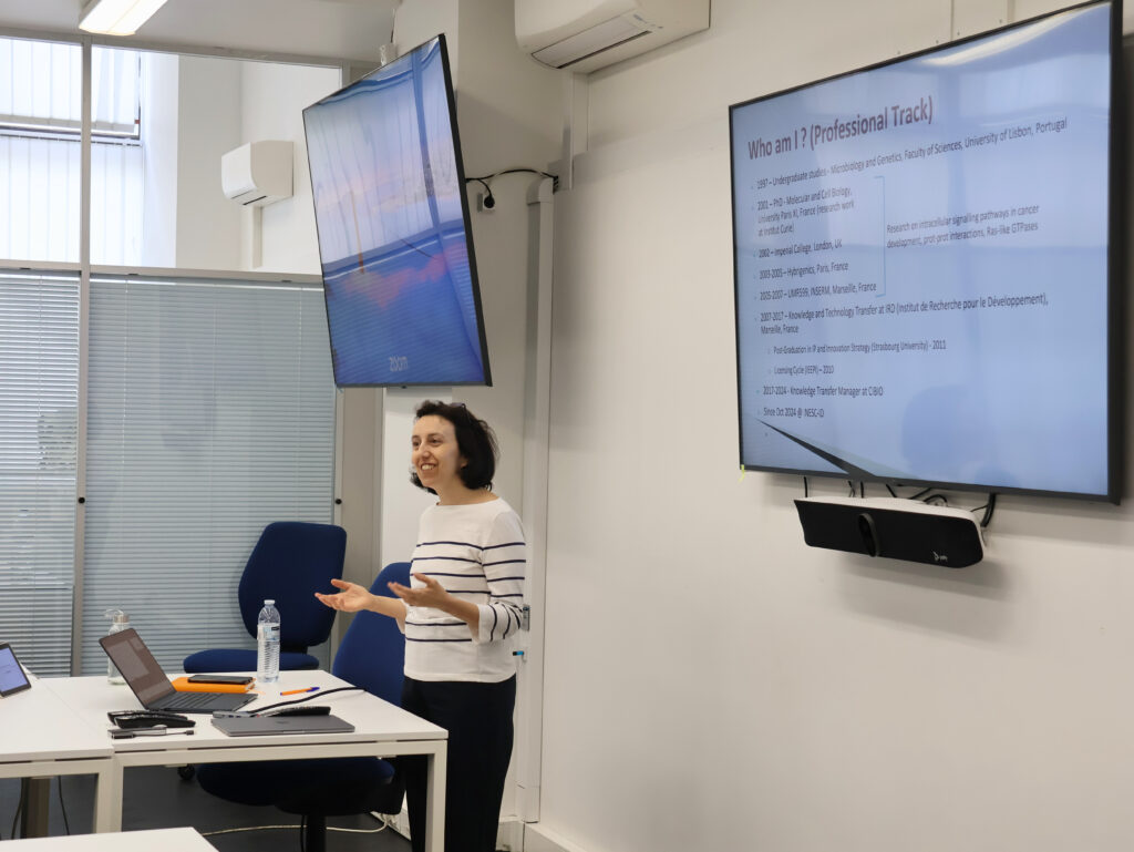 On May 19, a group of PhD students gathered for their 8th INESC-ID PhD Students Meetup and were introduced to Sandra Aresta, Knowledge Transfer Manager at INESC-ID, who presented the topic “Beyond Publications: Patents, Spin-offs, and Alternative Paths for PhDs”. During the session, Sandra shared her personal journey and professional experience, offering insights into what it means to work in the field of technology transfer. She then explained the processes within INESC-ID and how PhD students can benefit from this field, including filing patents or even founding a startup.