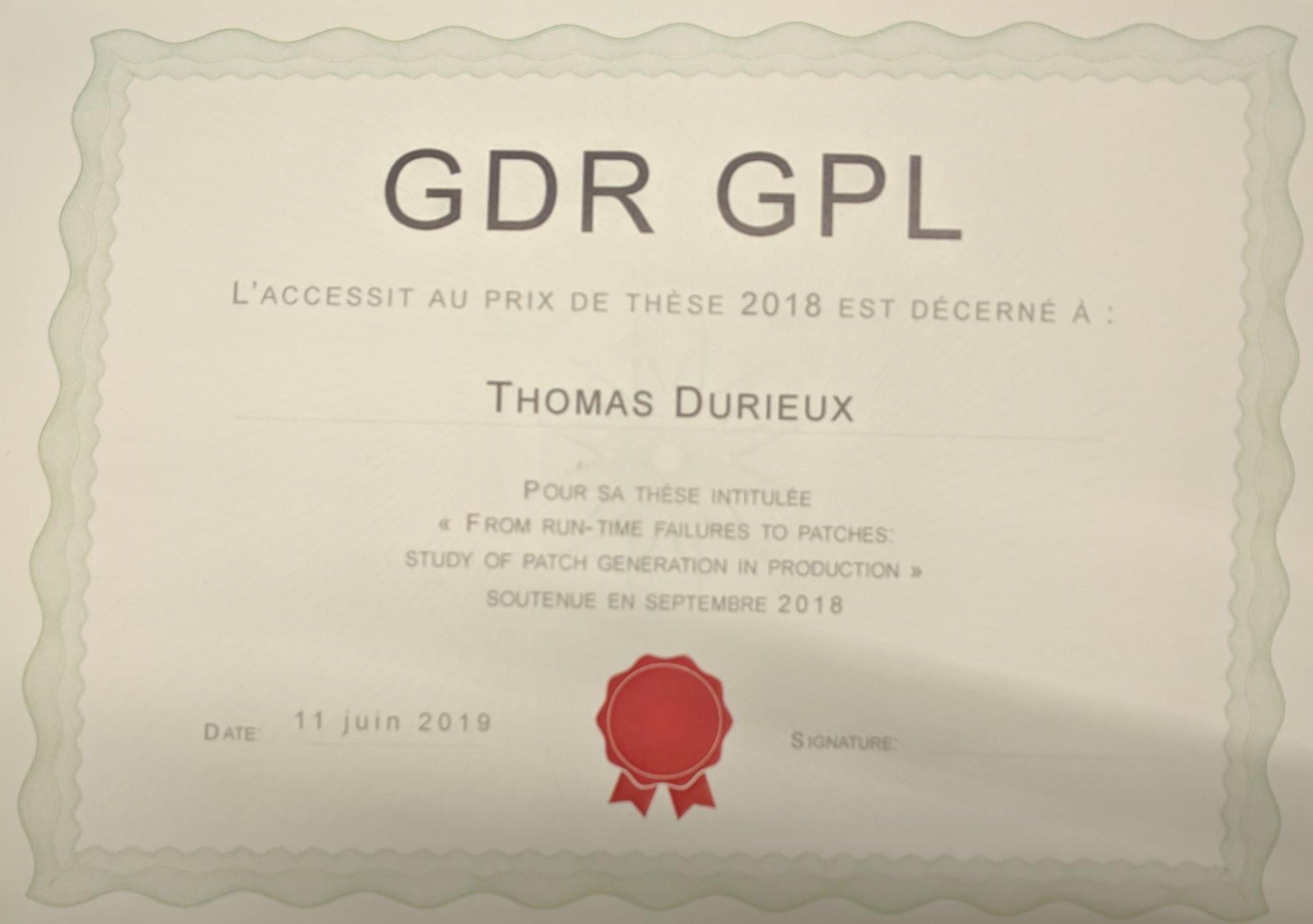 The doctoral thesis «From Runtime Failures to Patches: Study of Patch Generation in Production» of our researcher Thomas Durieux