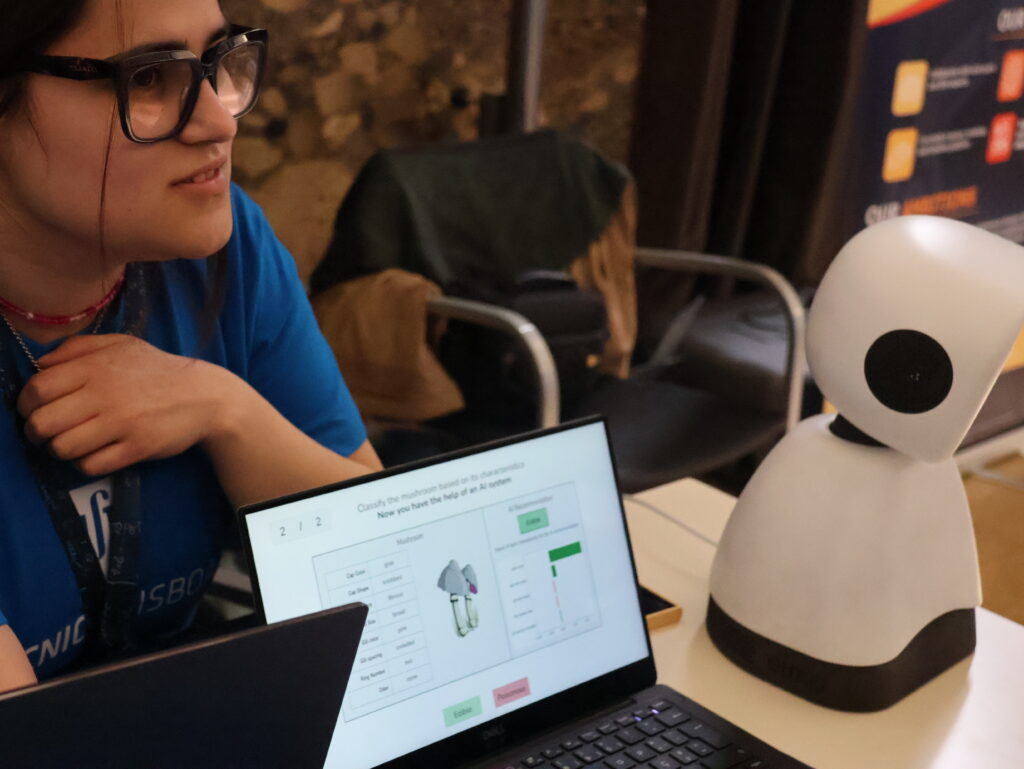Next to her, fellow PhD student Sandra Andrade, demonstrated the adorable AI robot ELMO and the Mushroom Game – an engaging way to explore how trust influences AI assisted decision-making – perfect for sparking discussions about AI and even teaching a little mycology along the way. “I was surprised by the age range of the participants, from babies to grandparents, all very interested in artificial intelligence and robots”, Sandra noted.