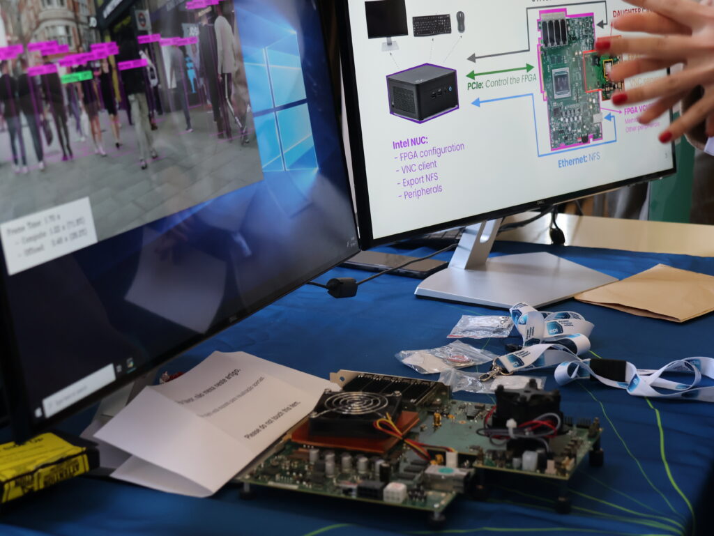 At the next booth, INESC-ID researchers Pedro Tomás, Tiago Rocha and Nuno Neves, from HPCAS, showcased a major achievement: a high-performance, energy-efficient chip developed under the European Processor Initiative (EPI). This powerful computer chip is helping Europe stay competitive and ahead in high-tech fields like artificial intelligence and scientific simulations.