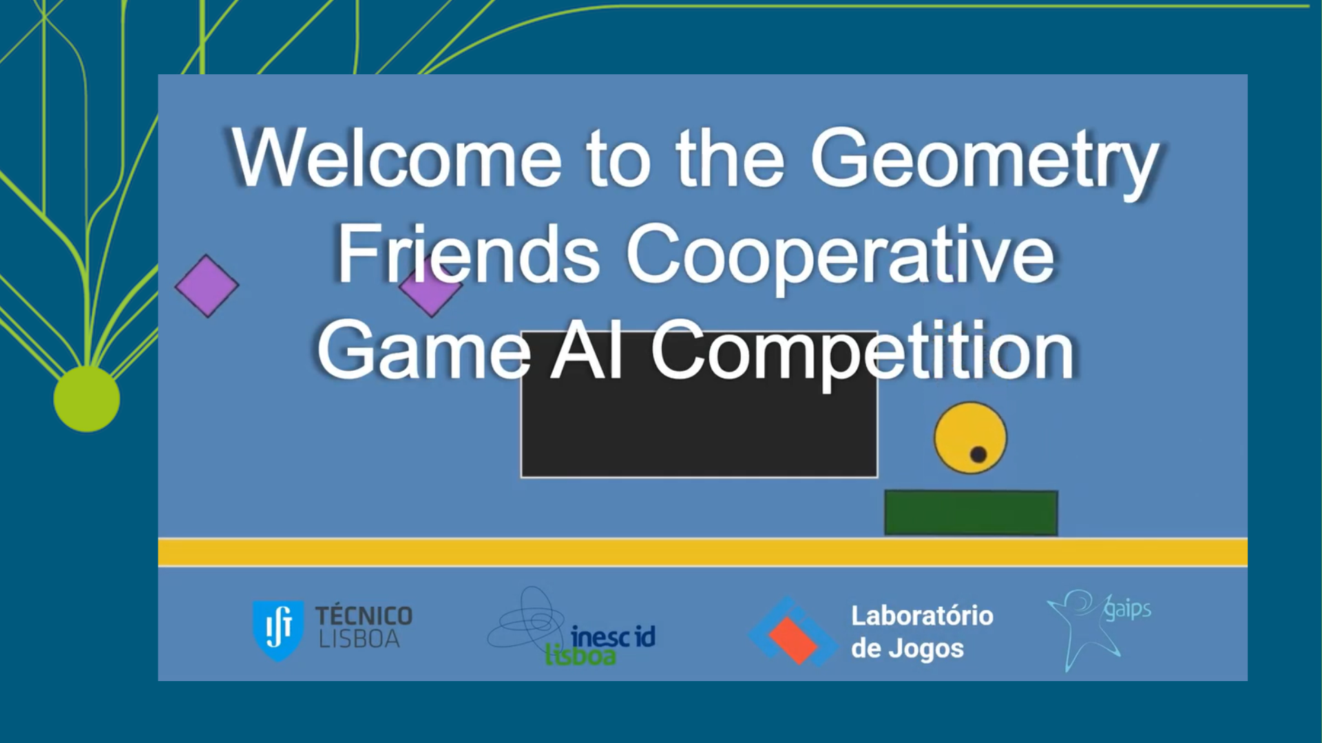 Geometry Friends raises interesting problems for Artificial Intelligence (AI) agents. For example, to successfully solve a Geometry Friends level, players need to: deal with coordination at different layers, from motion control (e.g. achieving perfect timing) to level resolution (e.g. devising shared plans); deal with limited actuation situated in a simulated physics environment (with gravity and friction); solve platform (skill) based puzzles, which involves discovering the proper order to collect the diamonds and identifying the points where collaboration is needed; do all the above in real-time!