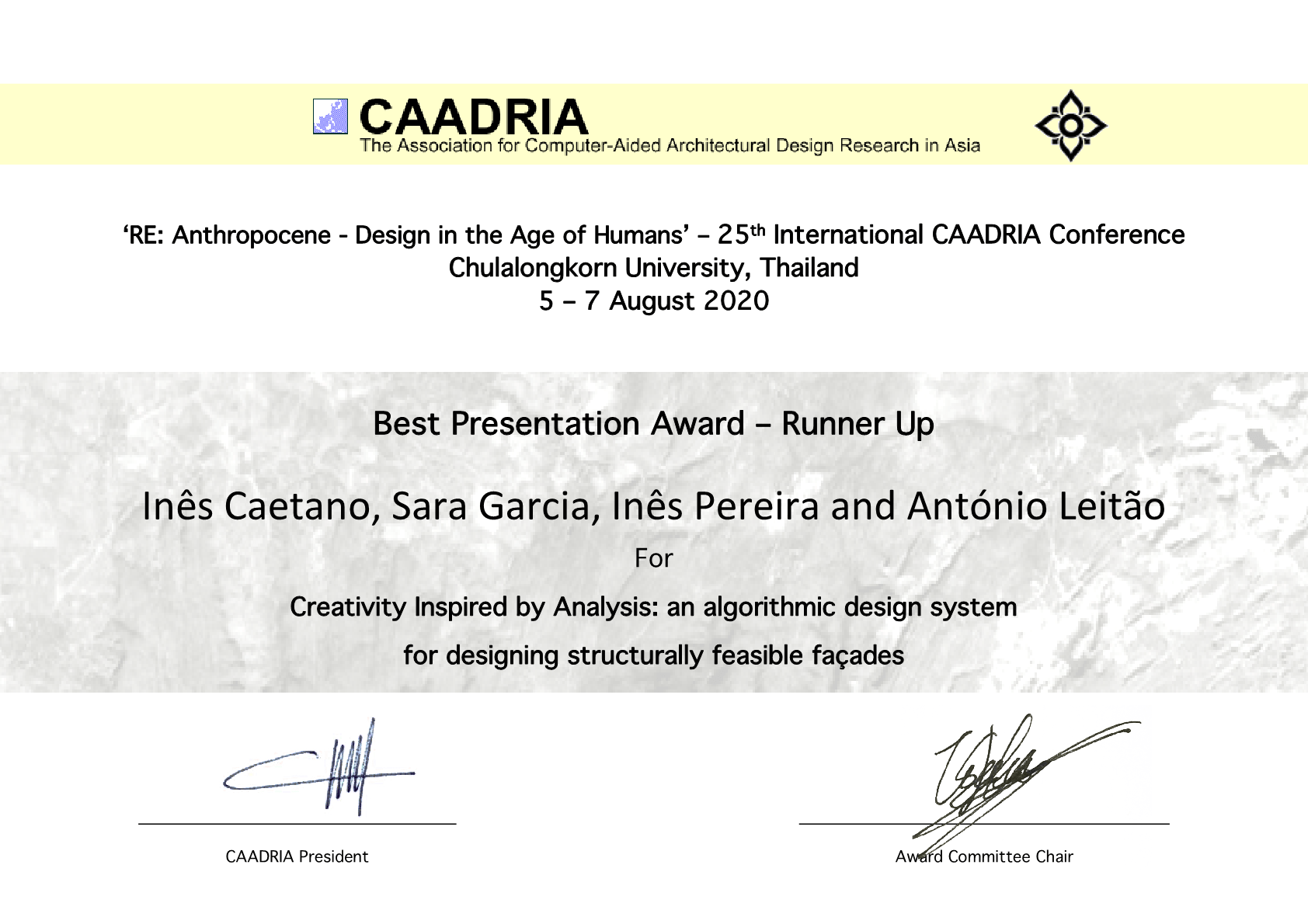 The second award, Best Presentation – Runner Up Award, was granted to the presentation “Creativity by Analysis: an algorithmic design system for designing structurally feasible façades”, co-authored by Inês Caetano, Sara Garcia, Inês Pereira, and António Leitão.