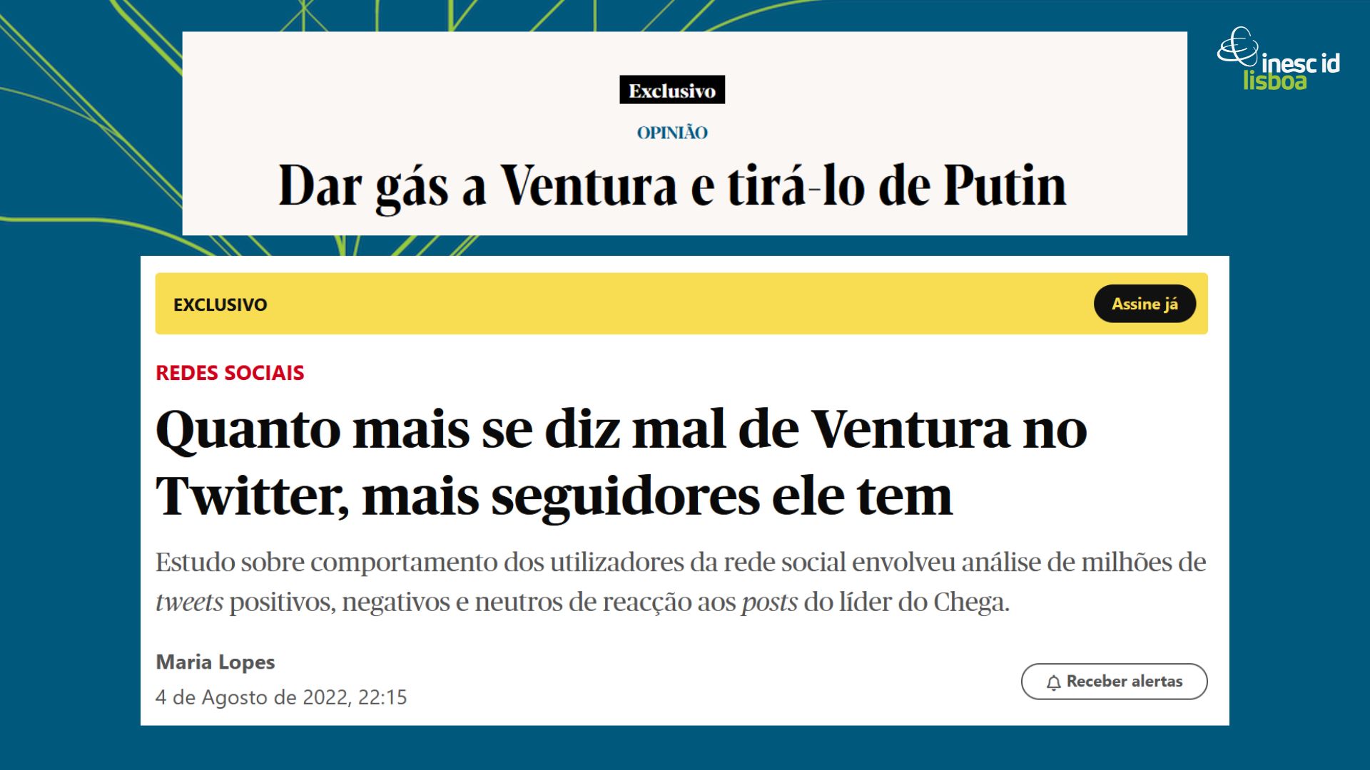 In the opinion piece Dar gás a Ventura e tirá-lo de Putin (written by the Universidade do Minho economics professor Luís Aguiar-Correia) and the feature Quanto mais se diz mal de Ventura no Twitter, mais seguidores ele tem (authored by the journalist Maria Lopes), the online promotion of right-wing parties that Miguel Won and Jorge M. Fernandes (ICS-ULisboa) examined in an as-of-yet unpublished study steals the limelight.