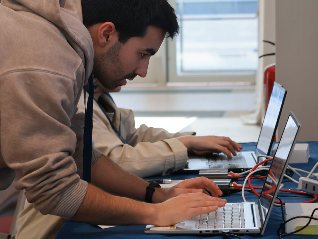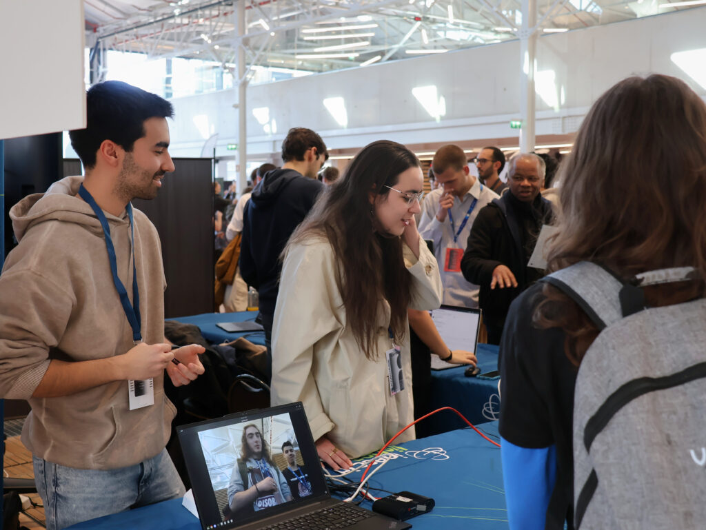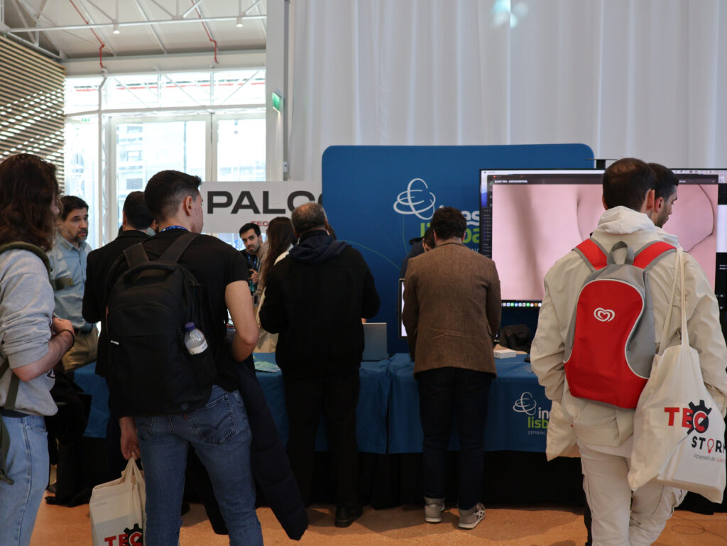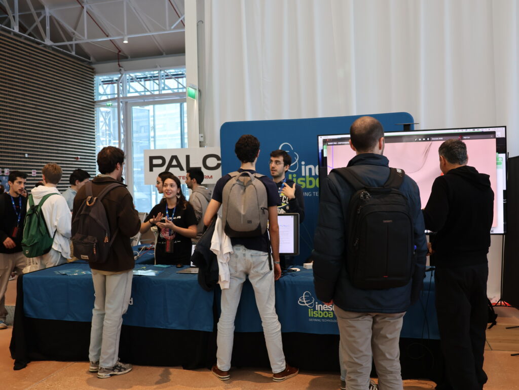 Among the various activities offered during the evening, the main attraction was the Product Showcase, where various companies and startups like Noxus.AI, CRIAM, Windcredible and others, gave a sneak peek of their products and activities. INESC-ID was the only research institute represented, displaying an eye-catching stand with several state-of-the art project demonstrations. Visitors and participants had the chance to talk to our researchers at our eye-catching stand enjoying a moment of calm and insightful discussions before the excitement and intensity of TecStorm25.