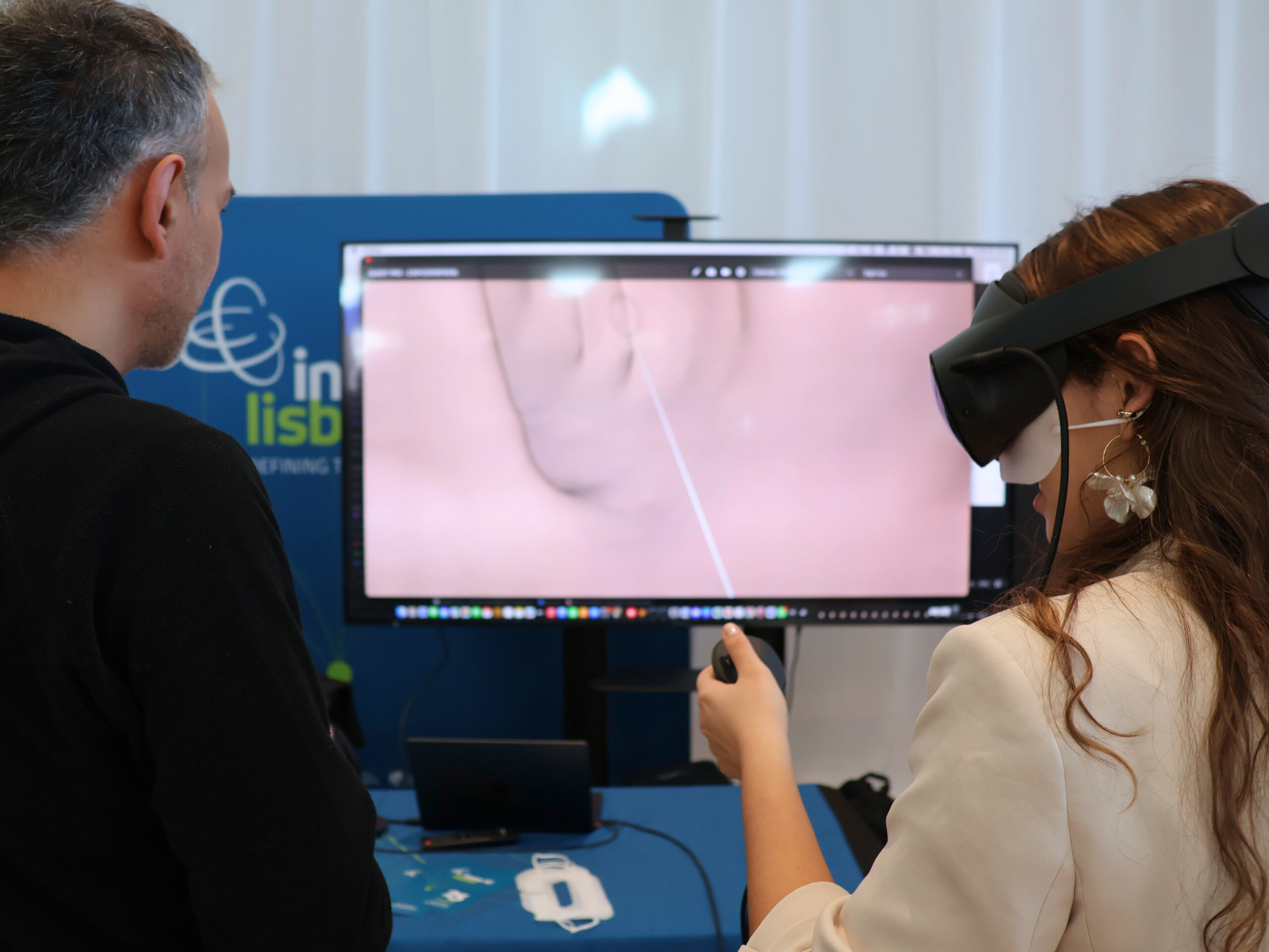 Ricardo Chaves, Joana Afonso and Pedro Martins showcased project DISCRETION, which intends to improve the security of military networks against emerging threats, while Larissa Montefusco provided passersby with an overview of EV4EU, a project, coordinated by Hugo Morais, with the ultimate goal of creating the conditions for electric mass deployment. Right next to EV4EU, Duarte Boto presented “REST: Interactive visualization tool for epidemic modelling”, which provides new insight in understanding the COVID-19 pandemic and for tracking future ones. Last but definitely not least, Anderson Maciel took over the big screen and, equipped with VR goggles, guided us through a 3D scheme of a colon, a new diagnosis VR tool that can prove itself as a new step for non-invasive diagnosis of health issues in the area.