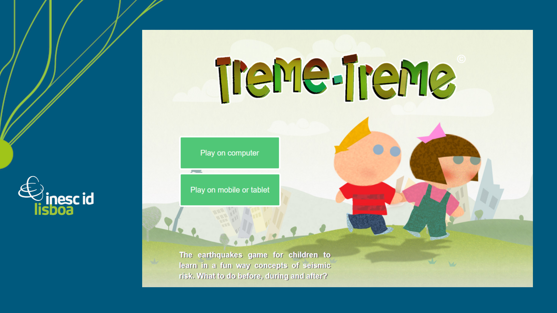 Developed by the Department of Civil Engineering and the Department of Computer Science and Engineering of Instituto Superior Técnico (including by INESC-ID researchers Rui Prada and Pedro Santos), Dreamstudios and Flaidisaine© (under the European project UPStrat-MAFA – “Urban disaster Prevention Strategies using MAcroseismic Fields and FAult Sources), Treme-treme teaches children how to behave during an earthquake, including building an emergency kit and learning to recognize the spots at home, school and work that are particularly dangerous during such an event.