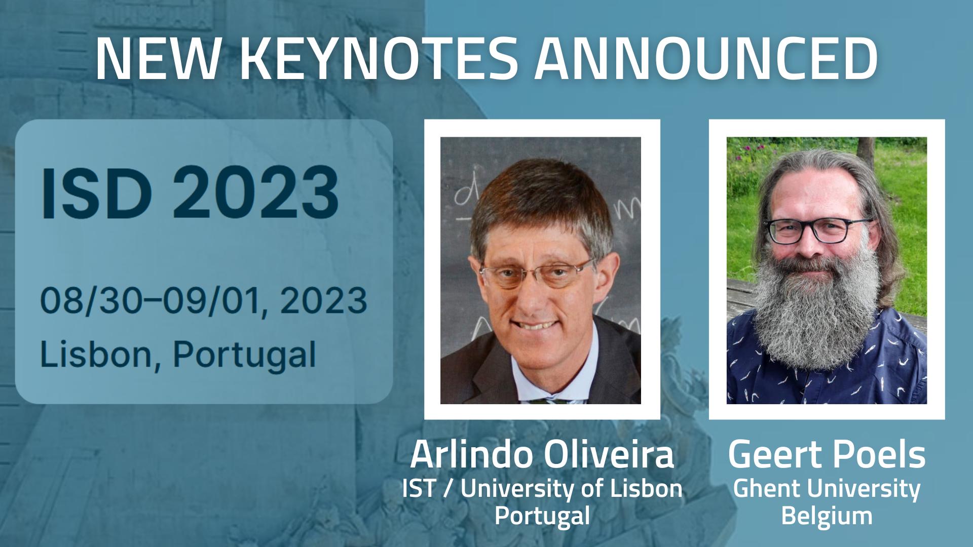 Two new keynotes have been announced for ISD 2023: Professor Arlindo Oliveira (IST / University of Lisbon) and Professor Geert Poels (Ghent University).
